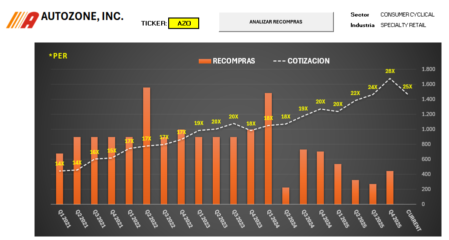 Ves la cotización y el PER exacto del momento en que recompraron.